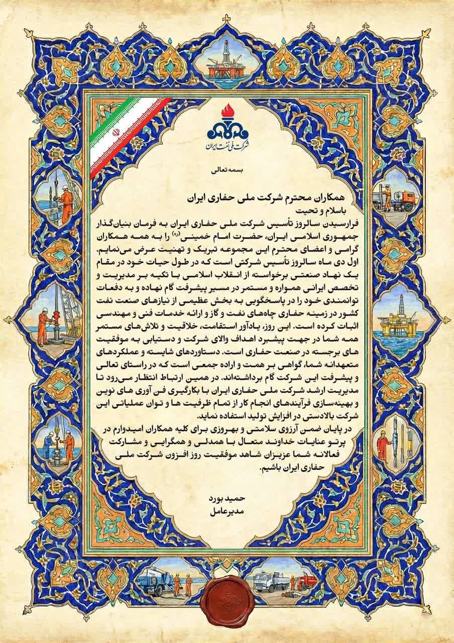 «فرارسیدن سالروز تأسیس شرکت ملی حفاری ایران به فرمان بنیان‌گذار جمهوری اسلامی ایران، حضرت امام خمینی (ره) را به همه همکاران گرامی و اعضای محترم این مجموعه تبریک و تهنیت عرض می‌نمایم.