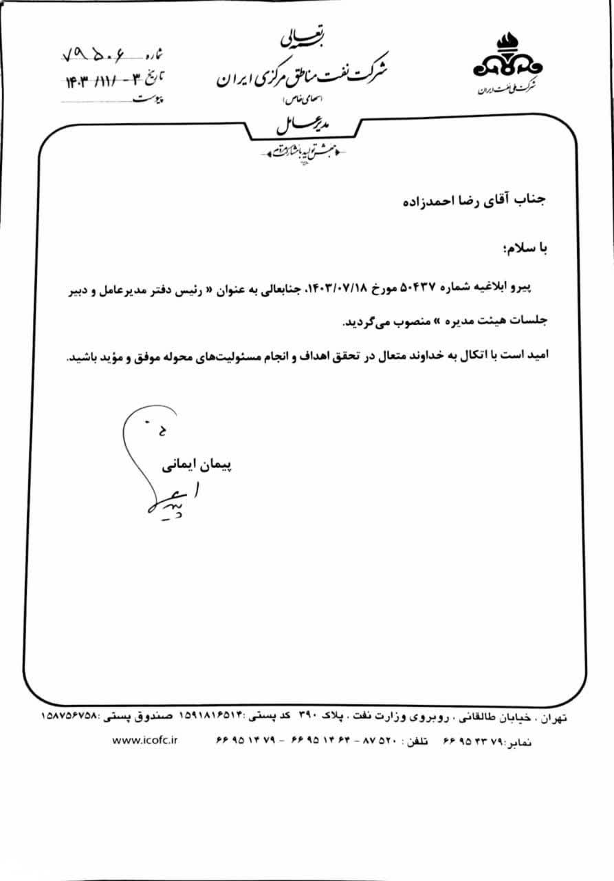 مدیرعامل شرکت نفت مناطق مرکزی ایران در حکمی «رضا احمدزاده» را به‌عنوان رئیس دفتر مدیرعامل و دبیر جلسات هیئت مدیره این شرکت منصوب کرد.