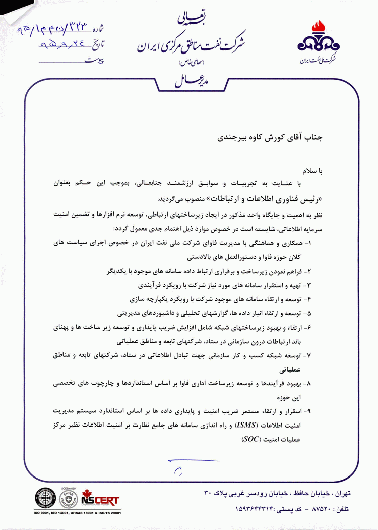 مدیر عامل شرکت نفت مناطق مرکزی ایران طی حکمی٬ مهندس کورش کاوه بیرجندی را به عنوان رییس فناوری اطلاعات و ارتباطات این شرکت منصوب کرد.