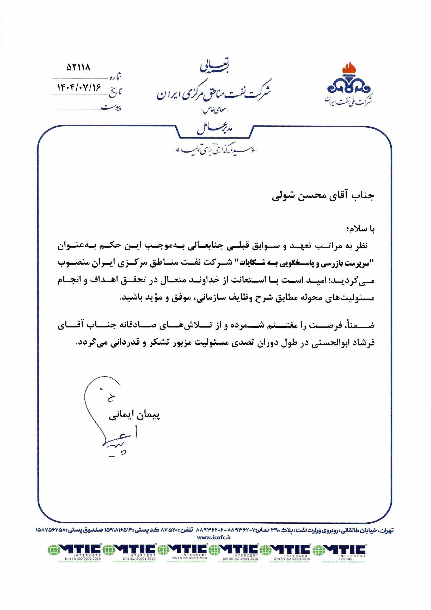 به گزارش پایگاه اطلاع رسانی نفت مناطق مرکزی ایران؛ مهندس پیمان ایمانی با صدور حکمی محسن شولی را به عنوان سرپرست بازرسی و پاسخگویی به شکایات این شرکت منصوب کرد.