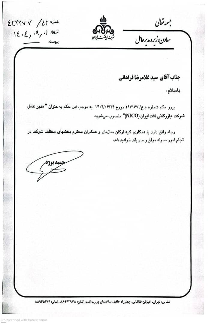 مدیرعامل شرکت بازرگانی نفت ایران منصوب شد با صدور حکمی از سوی حمید بورد، «سید غلامرضا فراهانی» به عنوان مدیرعامل شرکت بازرگانی نفت ایران (NICO)، منصوب شد.
