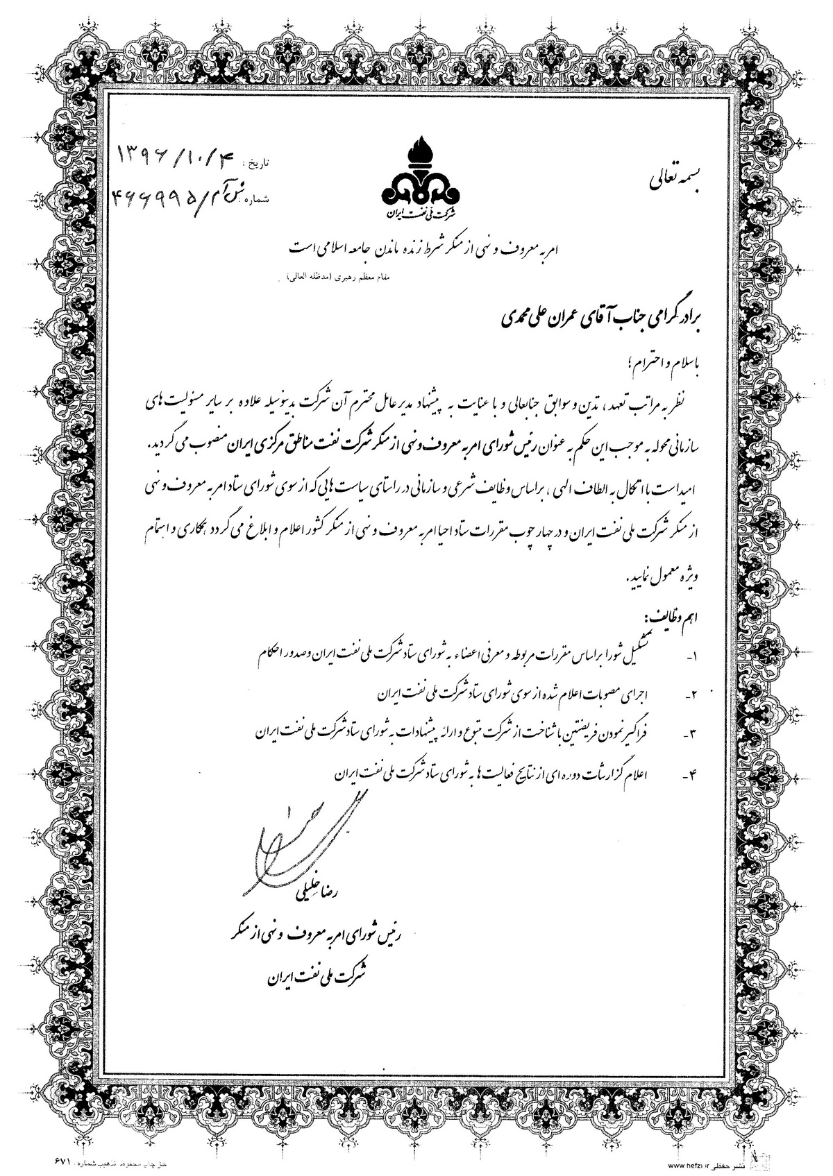 طی حکمی از طرف رضا خلیلی معاون مدیرعامل در امور عملیات غیرصنعتی شرکت ملی نفت ایران آقای عمران علی محمدی به سمت رئیس شورای امر به معروف و نهی از منکر شرکت نفت مناطق مرکزی ایران منصوب شد.