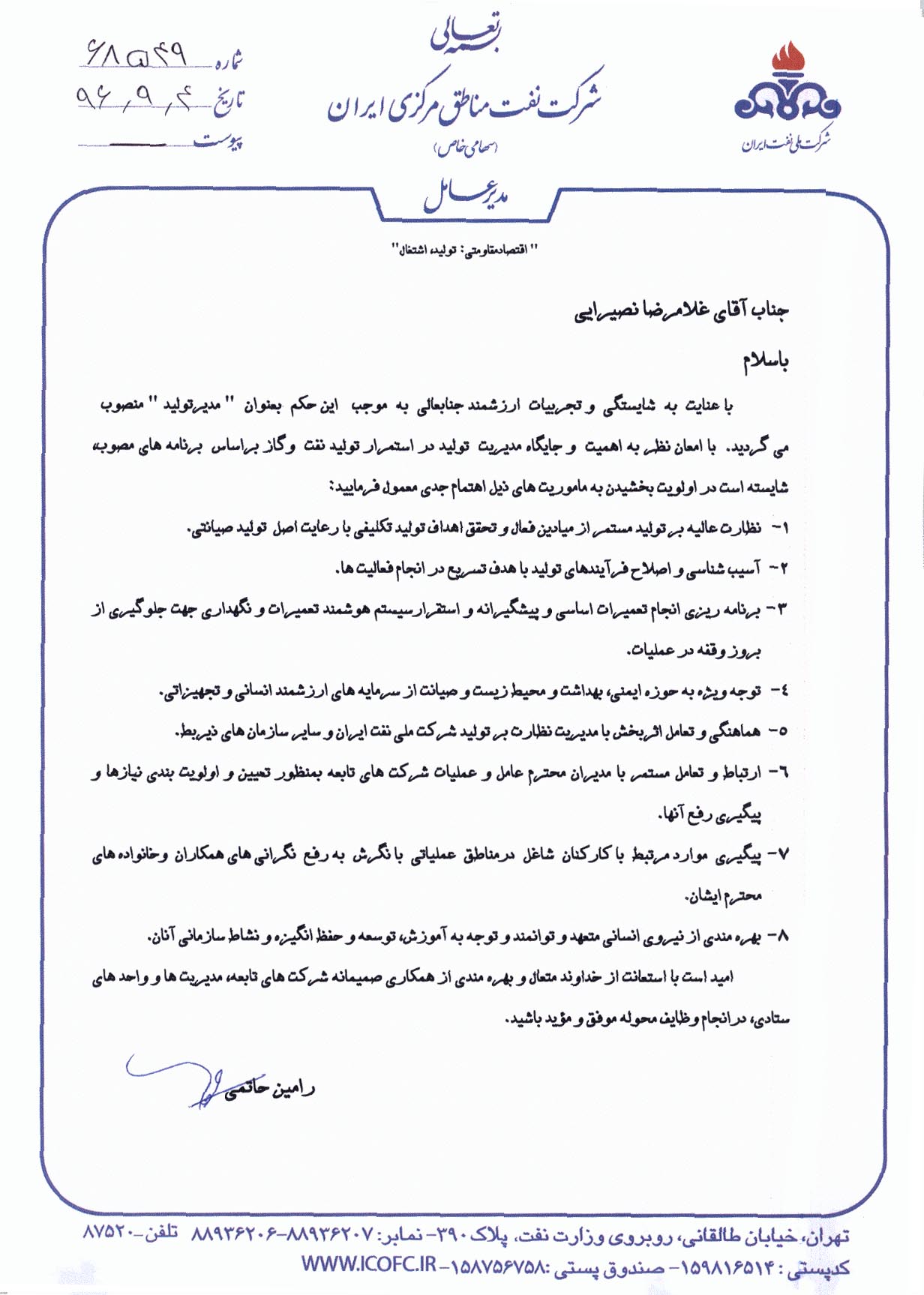 طی حکمی از سوی مهندس رامین حاتمی مدیر عامل شرکت نفت مناطق مرکزی ایران مهندس غلامرضا نصیرایی به عنوان مدیر تولید این شرکت منصوب شد.