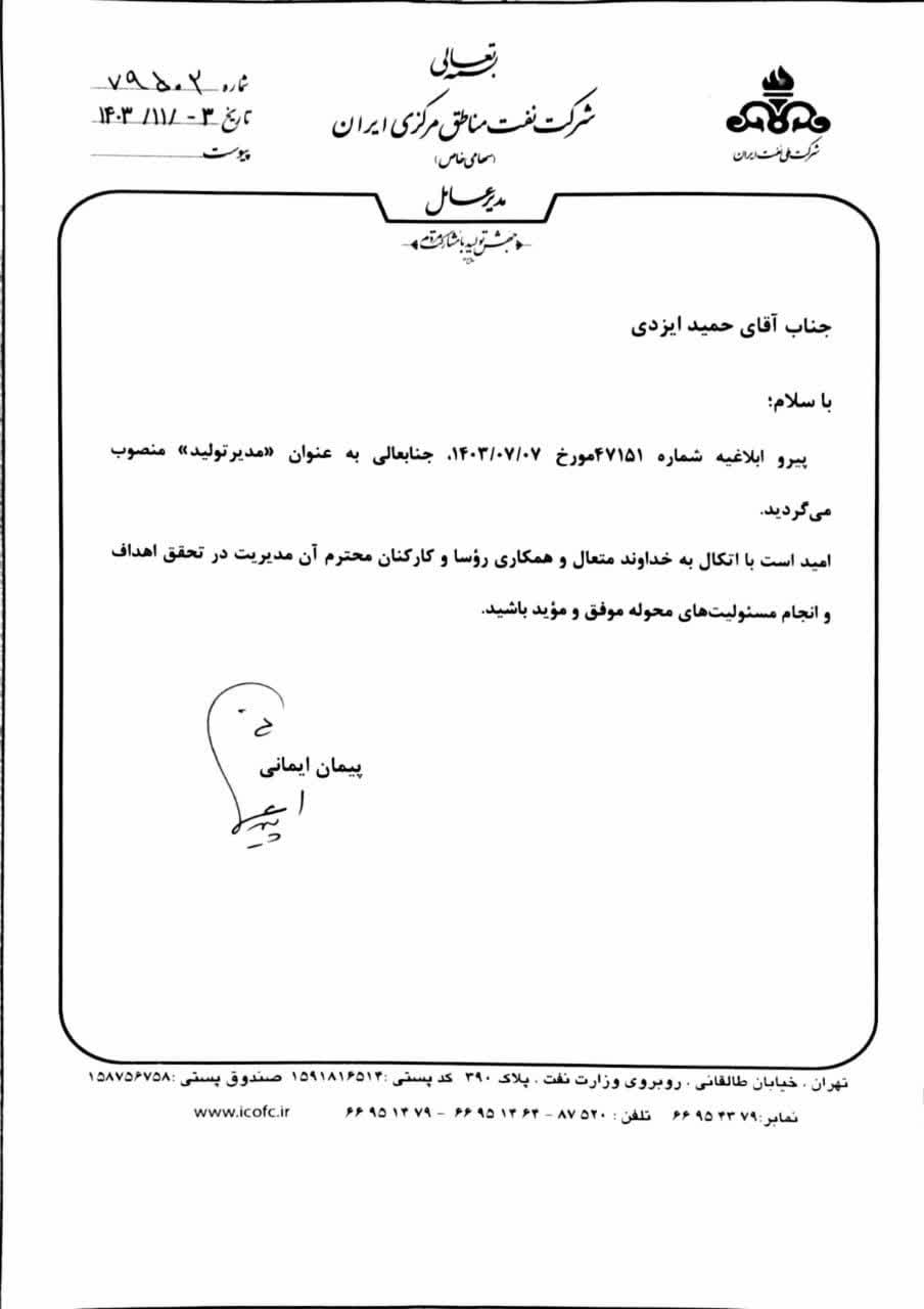 با حکم مدیرعامل شرکت نفت مناطق مرکزی ایران؛