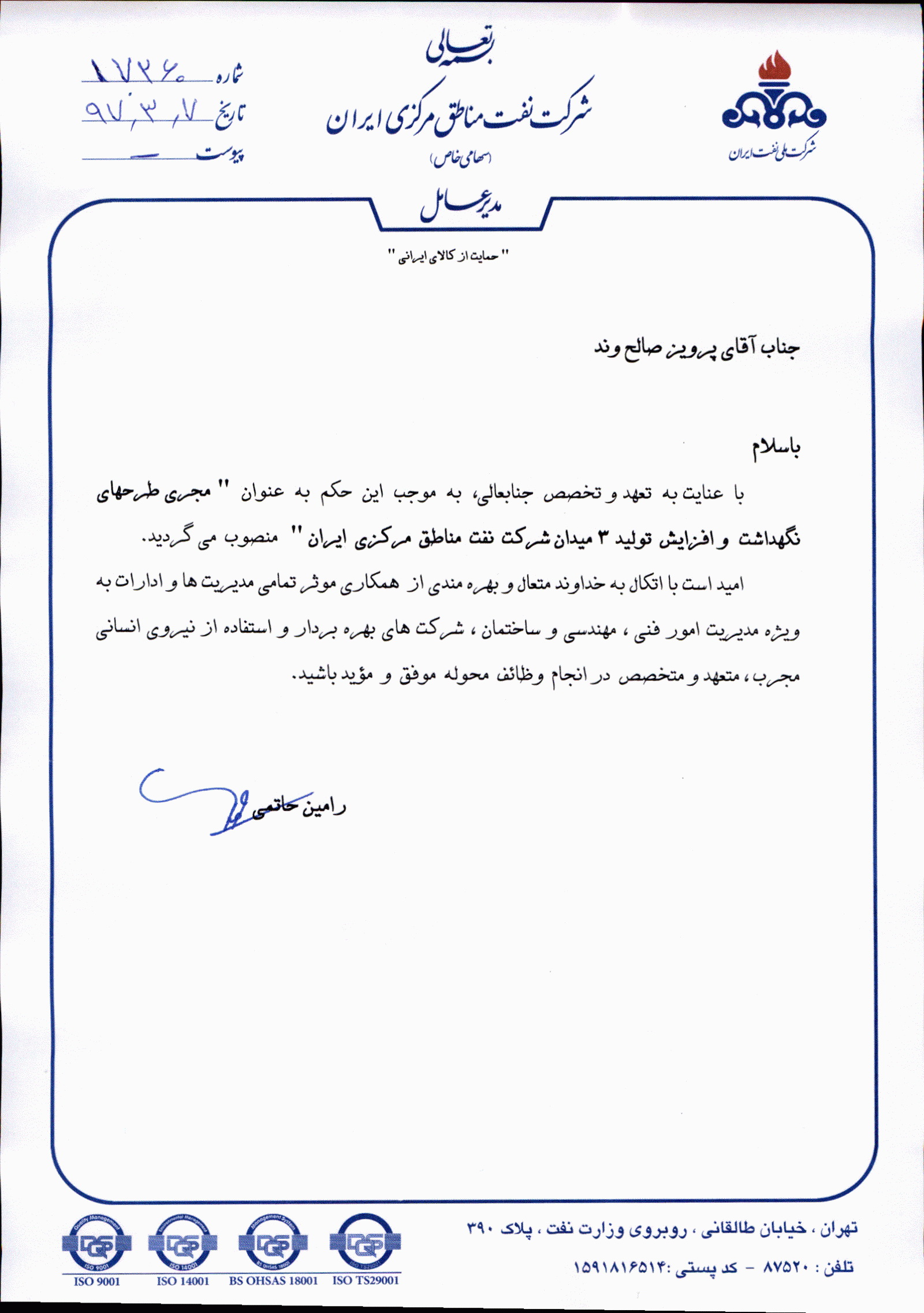 به گزارش روابط عمومی طی حکمی از طرف مهندس رامین حاتمی مدیر عامل مهندس پرویز صالح وند به عنوان مجری طرح های نگهداشت و افزایش تولید سه میدان شرکت نفت مناطق مرکزی ایران منصوب شد.