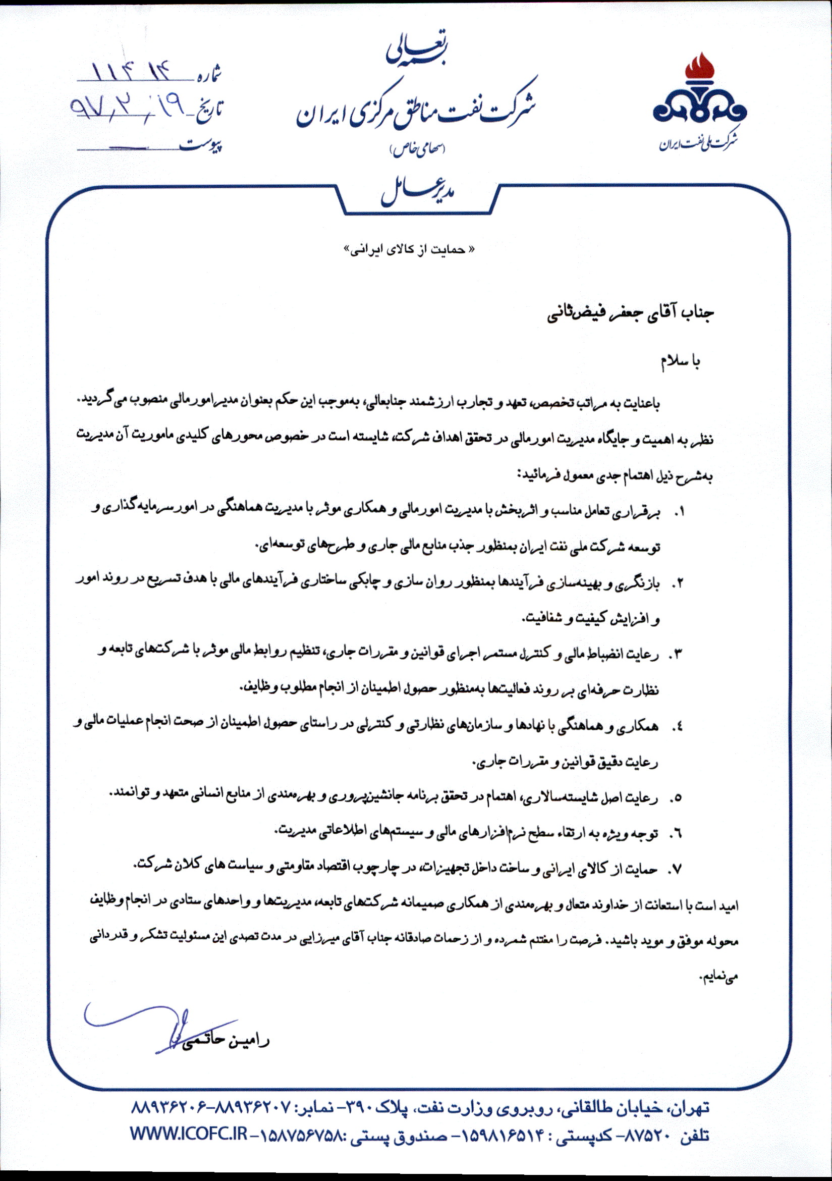 به موجب حکمی از سوی مهندس رامین حاتمی مدیرعامل شرکت نفت مناطق مرکزی ایران جناب آقای جعفر فیض ثانی بعنوان مدیر امور مالی این شرکت منصوب شد.