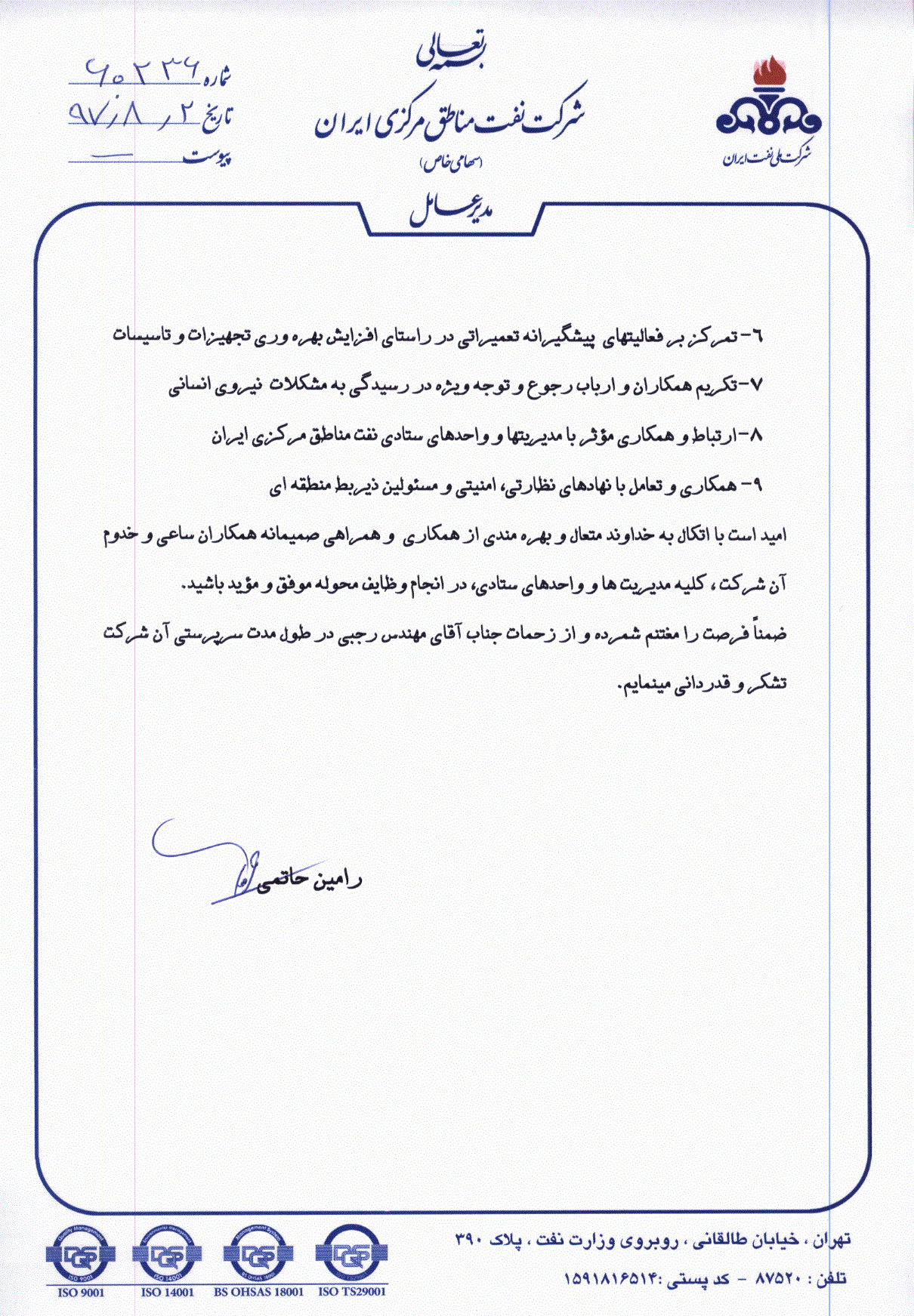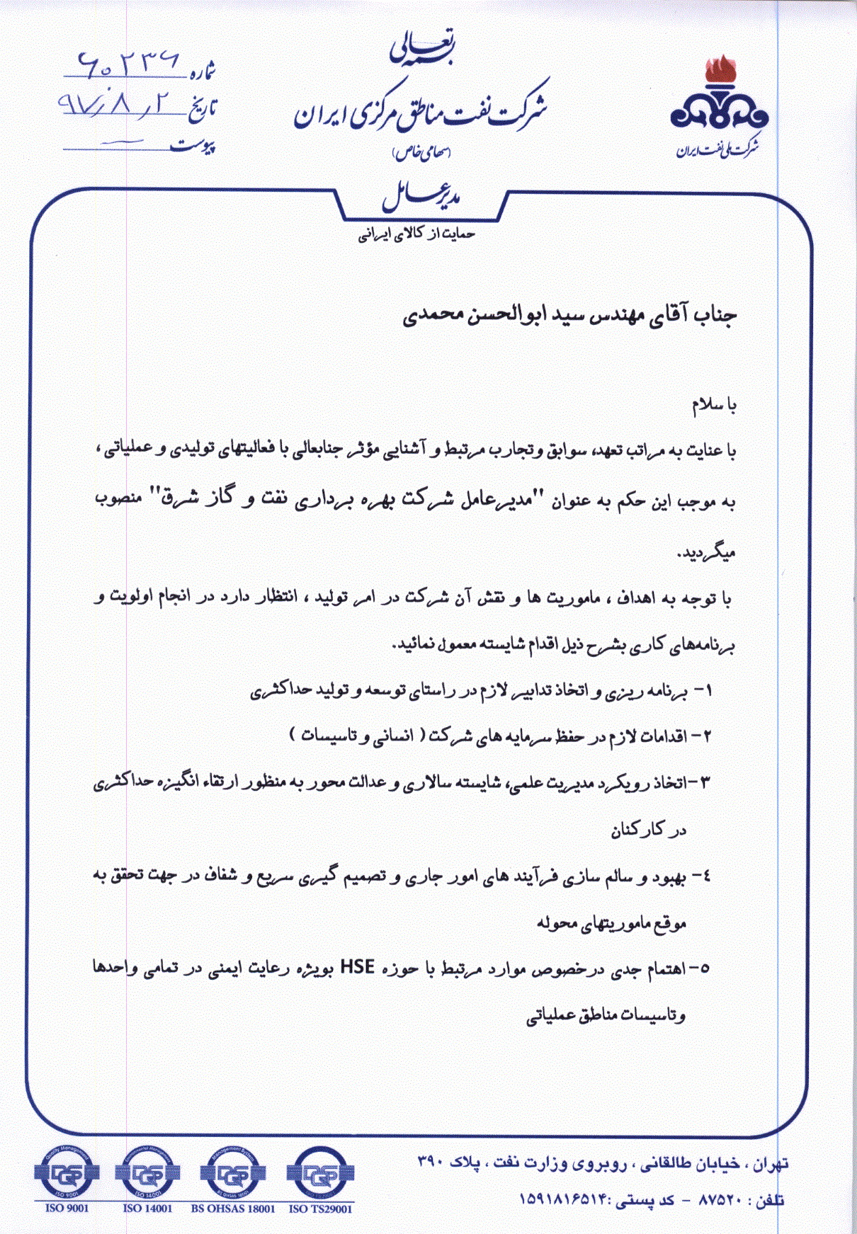 طی حکمی از طرف مهندس حاتمی مدیرعامل شرکت نفت مناطق مرکزی ایران مهندس سید ابوالحسن محمدی به سمت مدیرعامل شرکت بهره برداری نفت و گاز شرق منصوب شد.