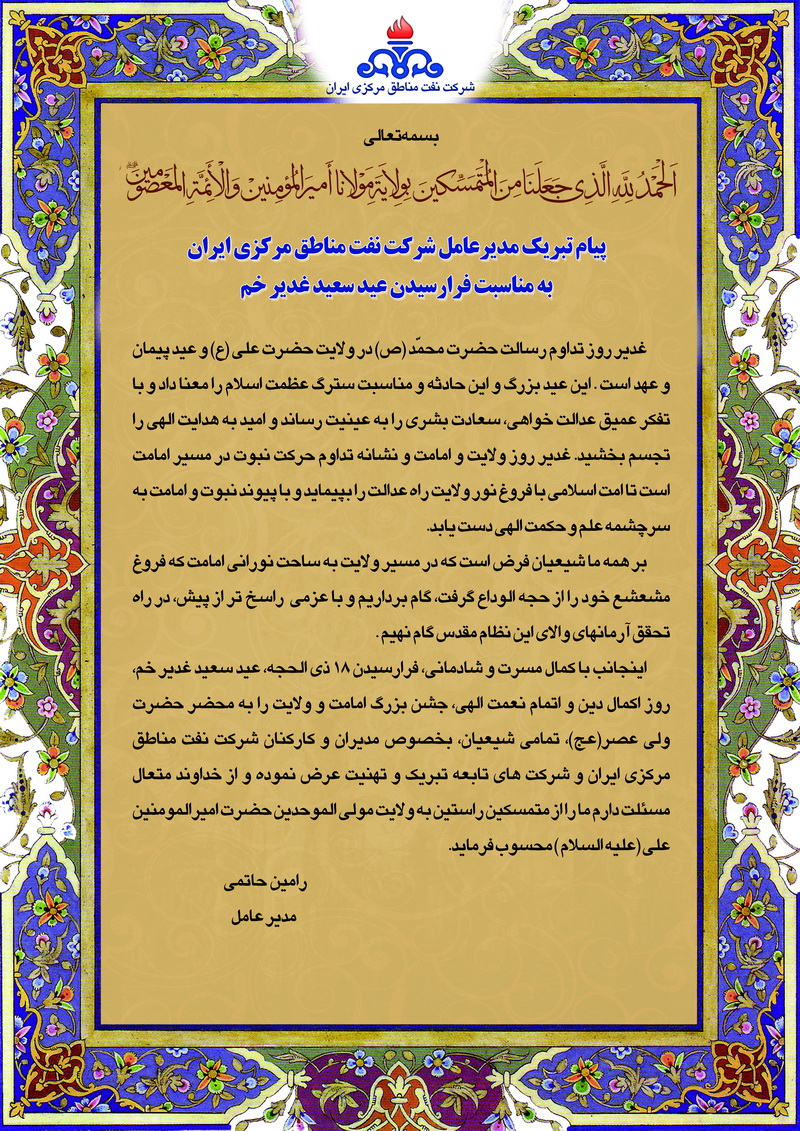 پیام تبریک مدیر عامل شرکت نفت مناطق مرکزی ایران بمناسبت فرا رسیدن عید غدیر خم