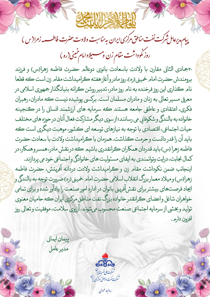 پیام مدیر عامل شرکت نفت مناطق مرکزی ایران بمناسبت ولادت حضرت فاطمه زهرا (س) روز نکوداشت مقام زن و میلاد امام خمینی (ره)