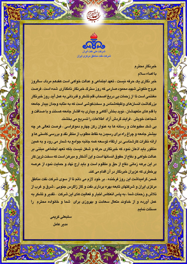 مهندس کریمی مدیر عامل شرکت نفت مناطق مرکزی ایران بمناسبت هفدهم مرداد، سالروز عروج ملكوتي شهيد محمود صارمي كه روز سترگ خبرنگار نامگذاري  شده است پیام تبریکی صادر کرد.