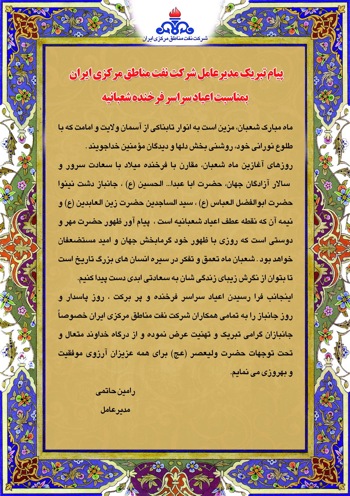 پيام تبريك مديرعامل شركت نفت مناطق مركزي ايران به مناسبت فرارسيدن اعياد شعبانيه
