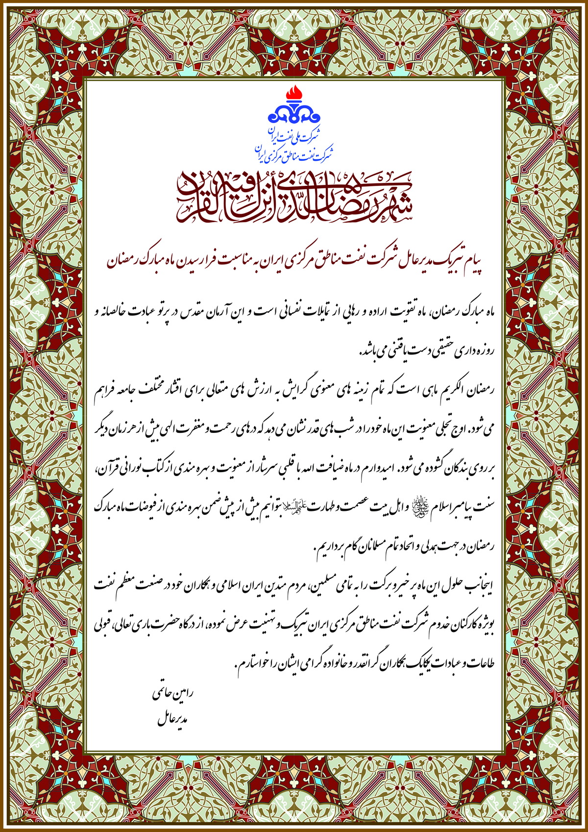 پیام تبریک مدیرعامل شرکت نفت مناطق مرکزی ایران بمناسبت حلول ماه مبارک رمضان