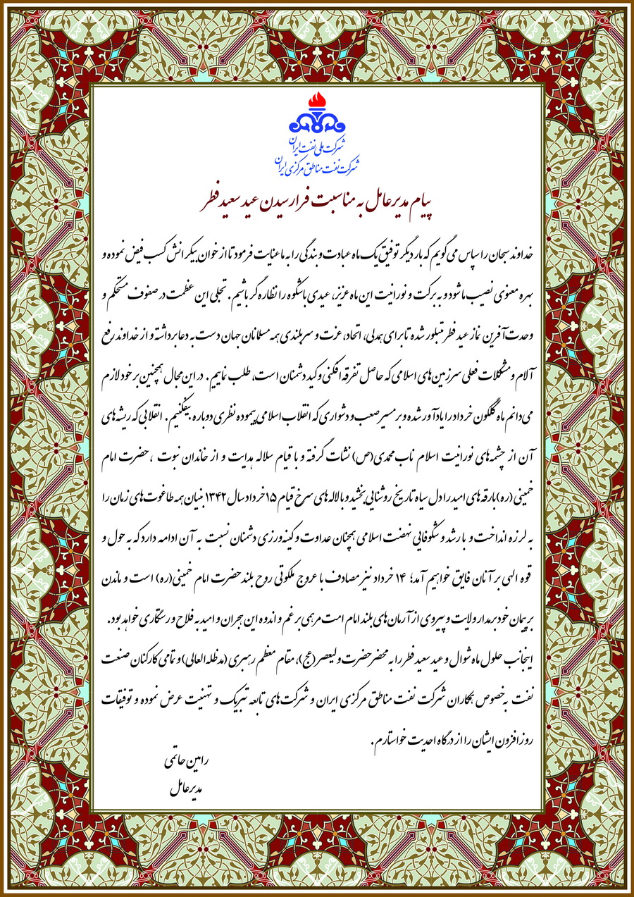 پیام مدیرعامل شرکت نفت مناطق مرکزی ایران بمناسبت حلول ماه شوال و عید سعید فطر