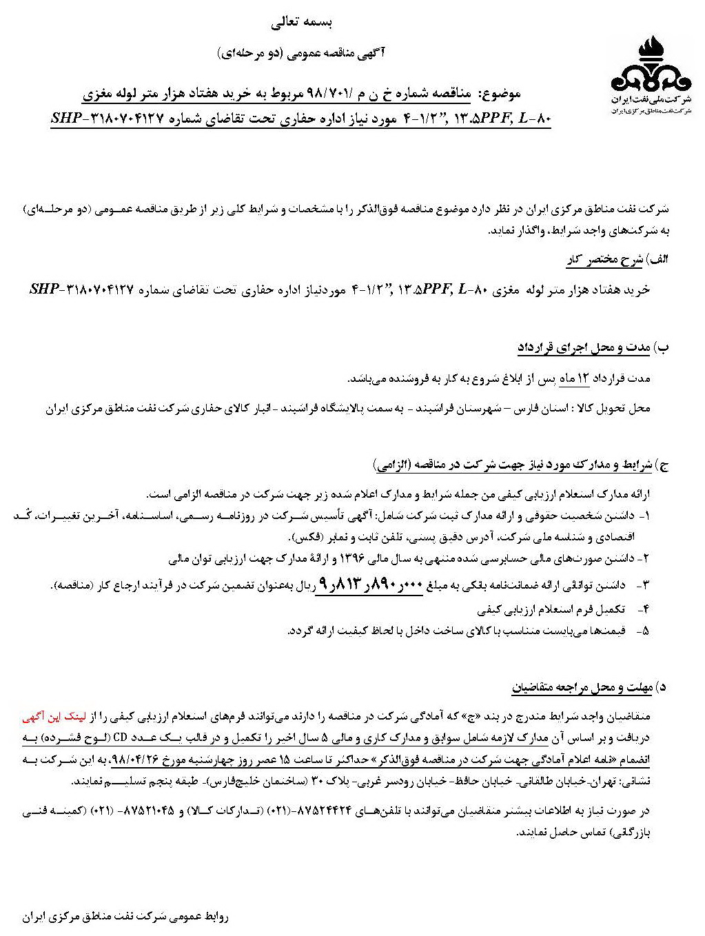 آگهي مناقصه عمومي (دو مرحلهای) شماره خ ن م /701 /98 مربوط به خريد هفتاد هزار متر لوله مغزي مورد نیاز اداره حفاري تحت تقاضاي شماره SHP-3180704127 متن صوتی گروه خبری : مناقصه کد خبر : 13119 کلمات کلیدی