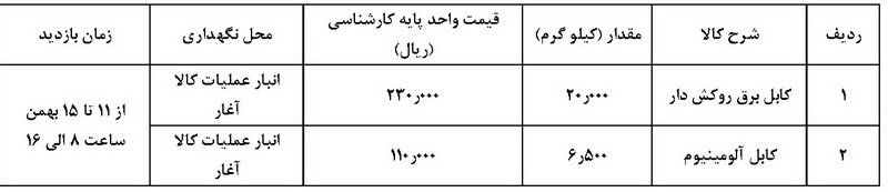 1 کابل برق روکش دار 000ر20 000ر230 انبار عملیات کالا آغار از 11 تا 15 بهمن ساعت 8 الی 16