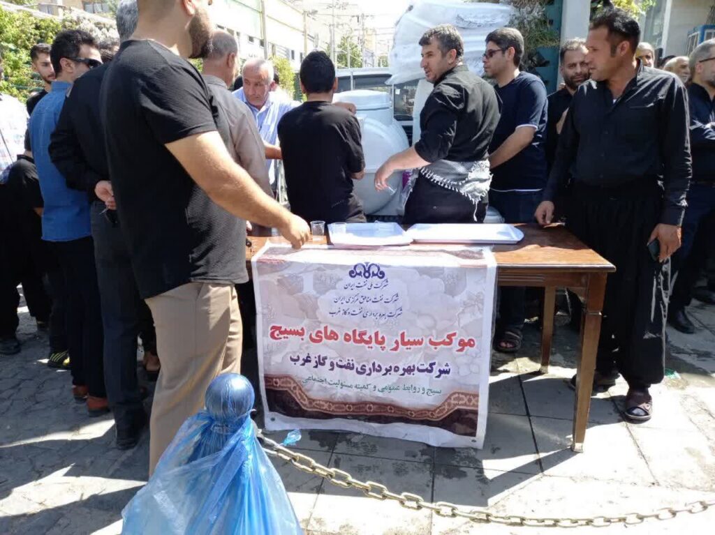 به گزارش پایگاه اطلاع رسانی شرکت نفت مناطق مرکزی ایران به مناسبت تاسوعا و عاشورای حسینی(ع) شرکت بهره برداری نفت و گاز غرب در راستای عمل به مسئولیت های اجتماعی خود، پشتیبانی و میزبانی از زوار امام حسین(ع) را با همکاری مشاور مدیرعامل در امور مسئولیت های اجتماعی و همراهی پایگاه بسیج حضرت ولیعصر (عج) شرکت نفت مناطق مرکزی ایران، پایگاه های بسیج رهروان ولایت نفت و گاز غرب و  پایگاه های بسیج مناطق عملیاتی تابعه نفت شهر، چشمه خوش (شهدای فکه) و ایلام (شهید شیرودی) تنگ بیجار (شهید کشوری) و با همکاری سپاه پاسداران و سازمان  بسیج استان های کرمانشاه و ایلام و با در اختیار گرفتن ماشین های یخچال دار، گالن های یخ، توزیع آب معدنی خنک و برپایی موکب سیار در پایانه های مرزی خسروی و مهران اقدام به توزیع آب معدنی نمود.