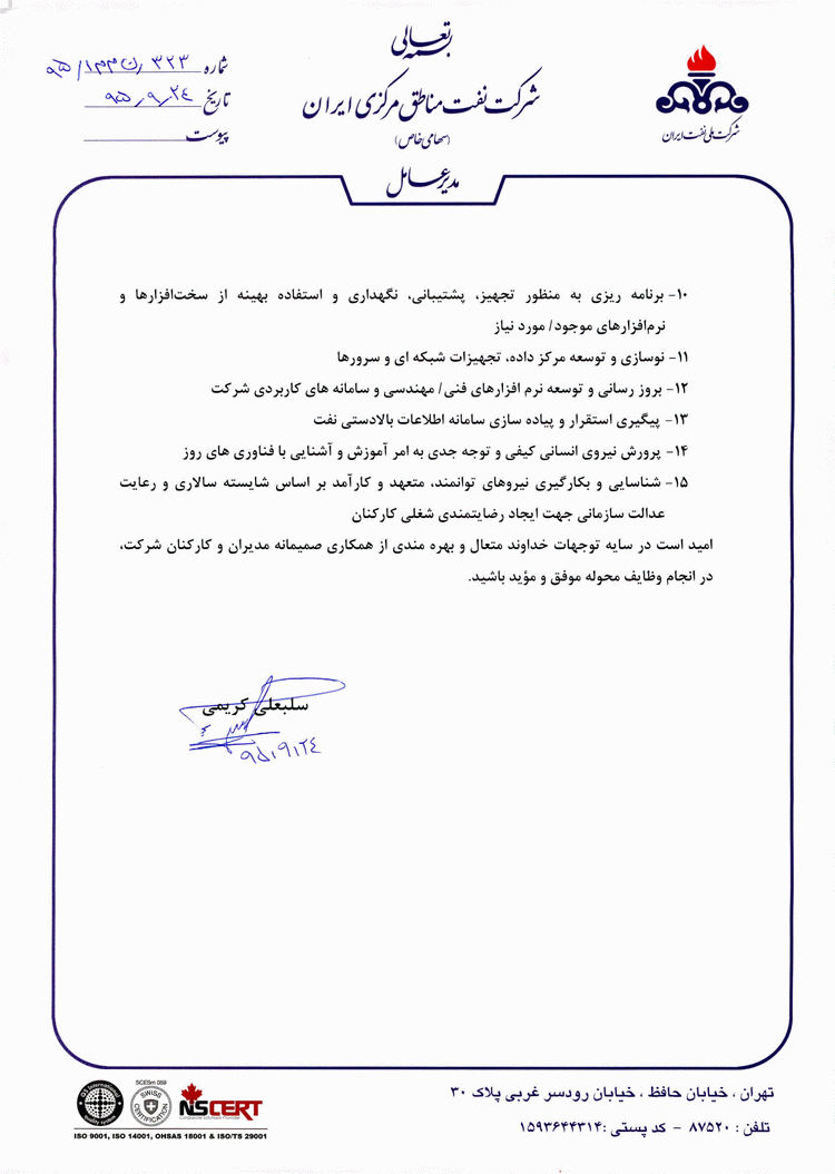 طی حکمی از طرف مهندس کریمی مدیرعامل: