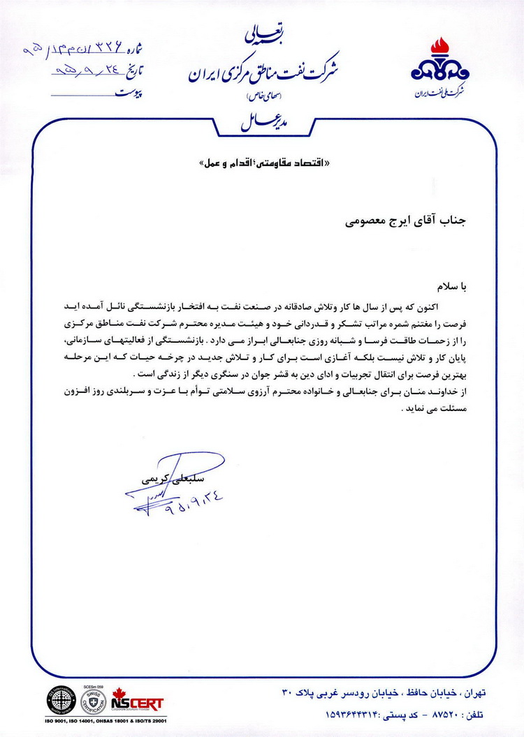 مهندس کریمی همچنین از زحمات چند ساله مهندس ایرج معصومی رییس پیشین فناوری اطلاعات و ارتباطات شرکت نفت مناطق مرکزی ایران که به افتخار بازنشستگی نایل آمد٬ تقدیر و تشکر کرده است.