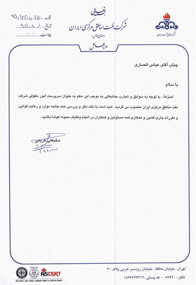 طی حکمی از طرف مهندس کریمی مدیر عامل شرکت نفت مناطق مرکزی ایران جناب آقای عباس انصاری به سمت سرپرست امور حقوقی این شرکت منصوب شد.