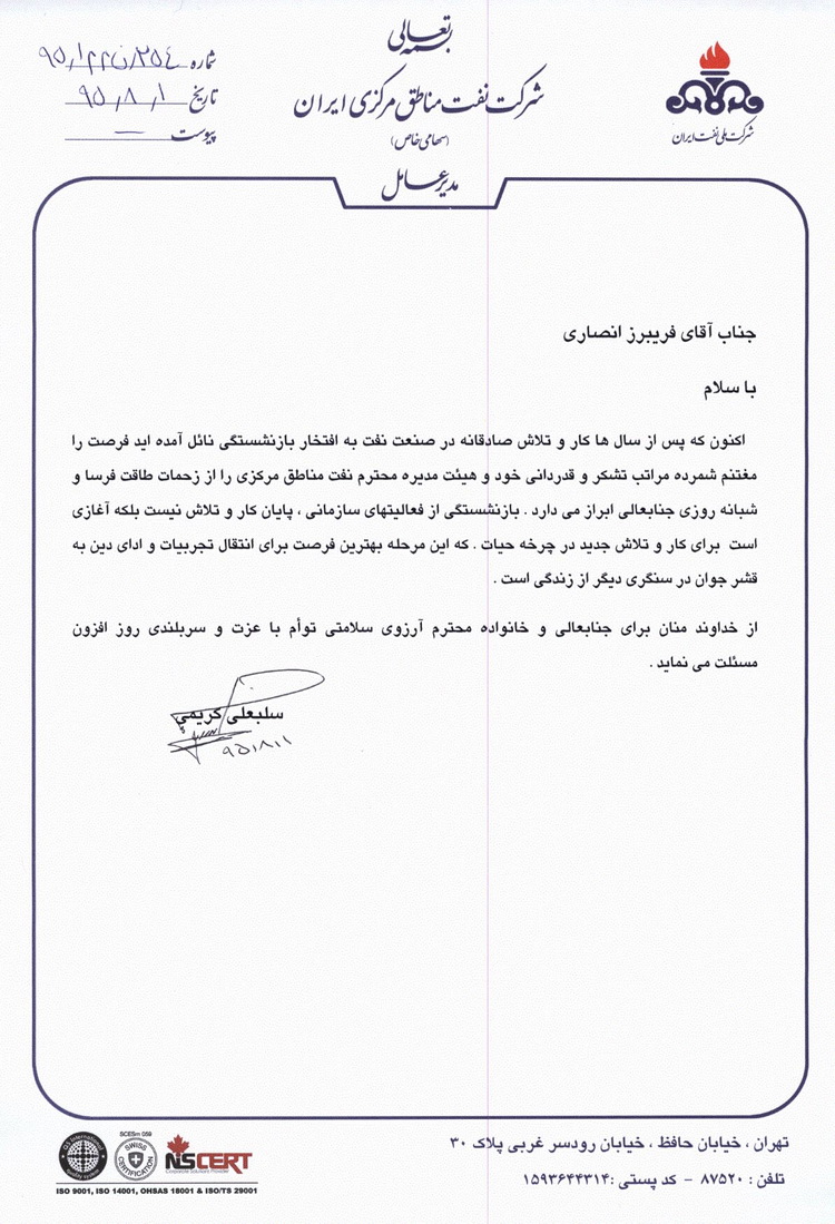 به گزارش روابط عمومی طی حکمی از طرف مهندس کریمی مدیر عامل شرکت نفت مناطق مرکزی ایران جناب آقای عباس انصاری به سمت سرپرست امور حقوقی این شرکت منصوب و از زحمات جناب آقای فریبرز انصاری رئیس سابق این امور که به افتخار بازنشستگی نائل آمد تشکر و قدردانی شد.