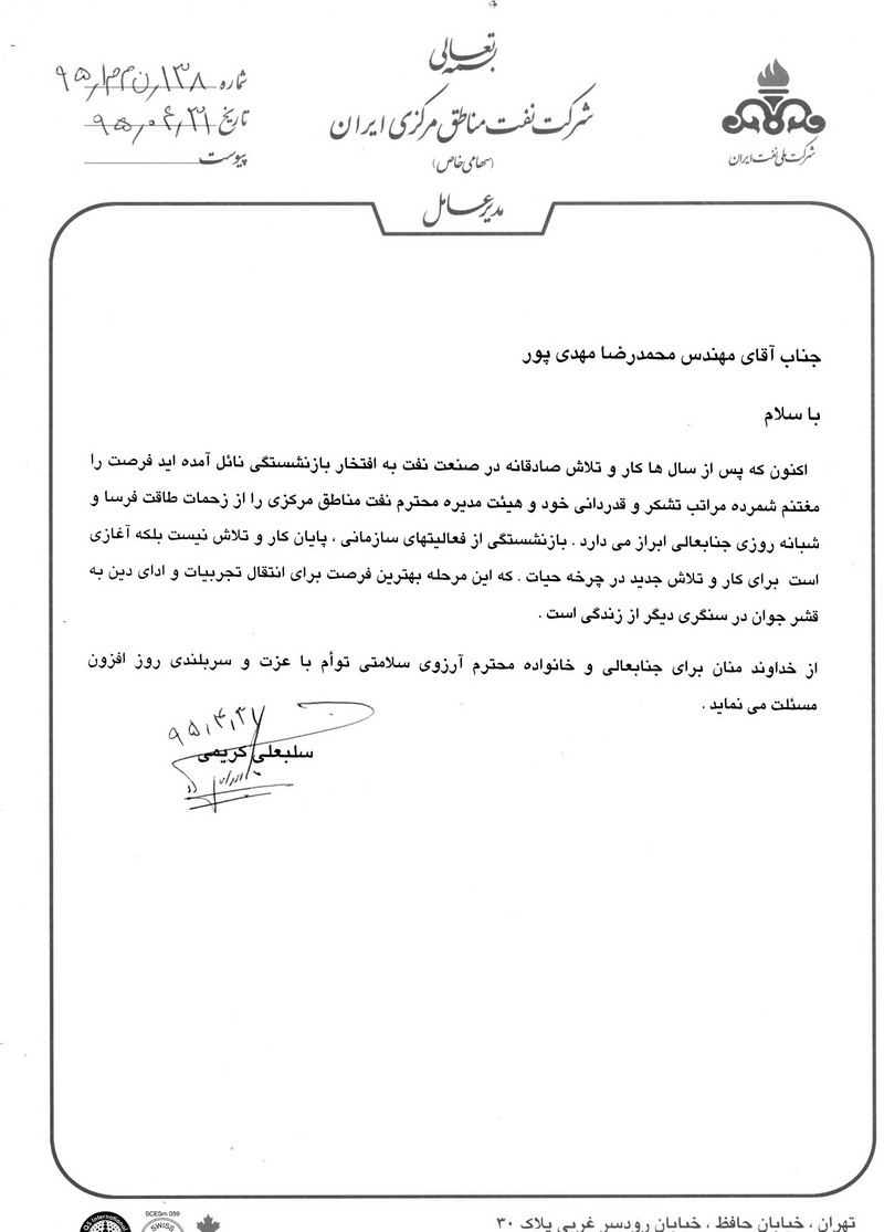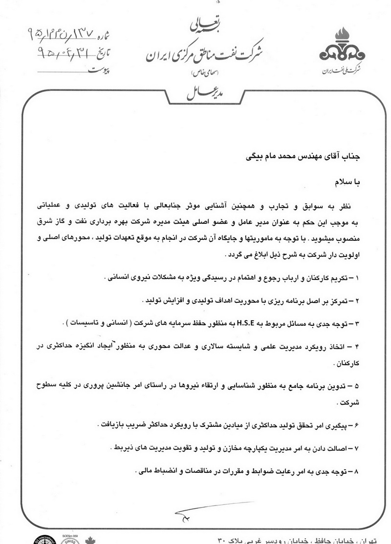 به گزارش روابط عمومی شرکت نفت مناطق مرکزی ایران طی حکمی از سوی مهندس کریمی مدیرعامل نفت مناطق مرکزی, مهندس مام بیگی به سمت مدیرعامل شرکت بهره برداری نفت و گاز شرق منصوب شد.