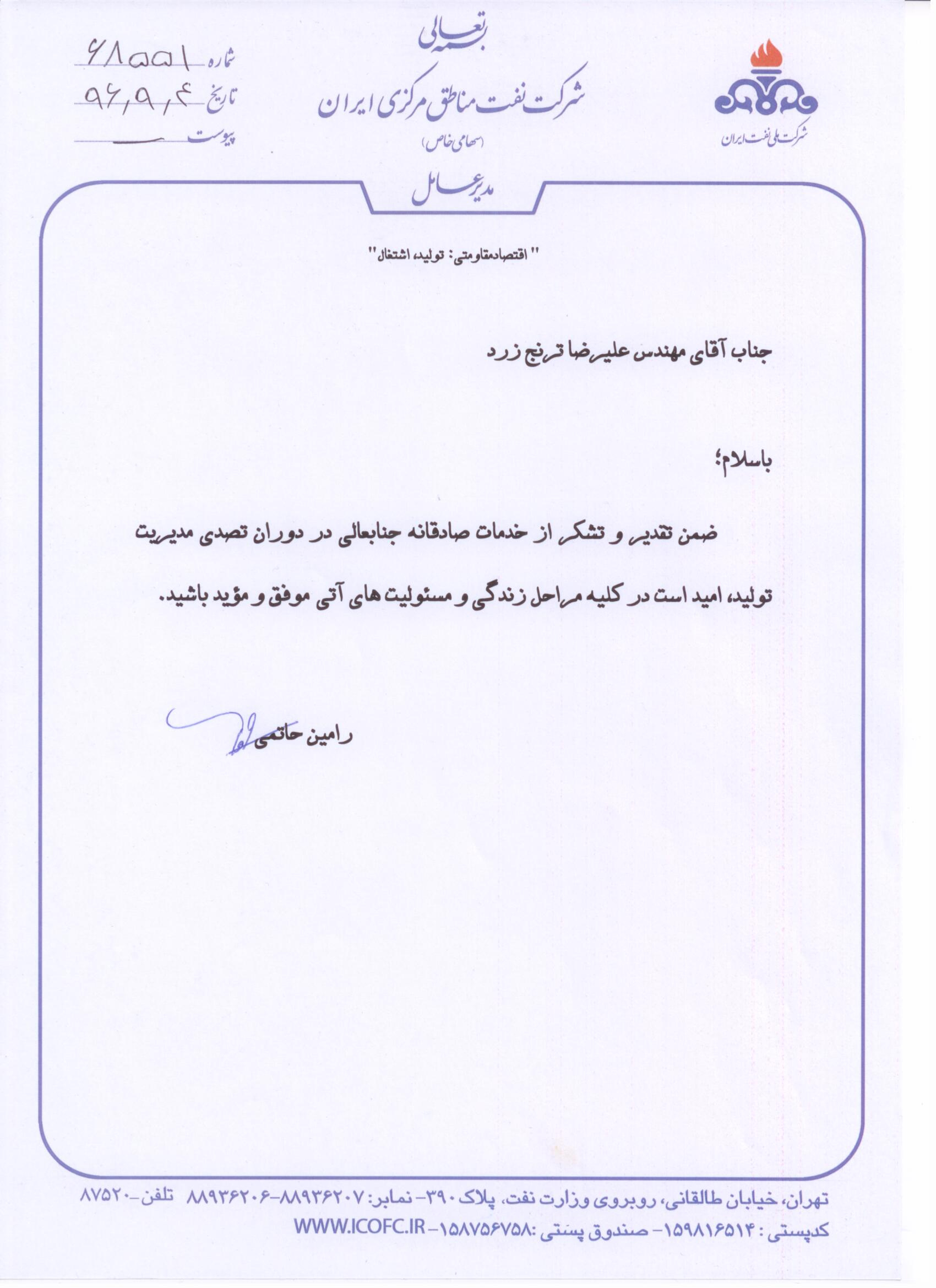 این گزارش می افزاید : مهندس حاتمی در این حکم انتصابی خواستار پیگیری موارد مرتبط با کارکنان شاغل در مناطق عملیاتی با نگرش رفع مشکلات و دغدغه های همکاران و خانواده های ایشان بوده و همچنین بهره مندی از نیروی انسانی متعهد و توانمند و توجه به آموزش ، توسعه و حفظ انگیزه و نشاط سازمانی آنان را در اولویت های این مدیریت قرار داده است. مدیر عامل شرکت نفت مناطق مرکزی ایران ، از زحمات مهندس علیرضا ترنج زرد مدیر سابق تولید این شرکت در مدت تصدی این مسئولیت تقدیر و تشکر به عمل آورده و برای ایشان آرزوی موفقیت درمراحل مختلف زندگی و مسئولیت های آتی دارد .