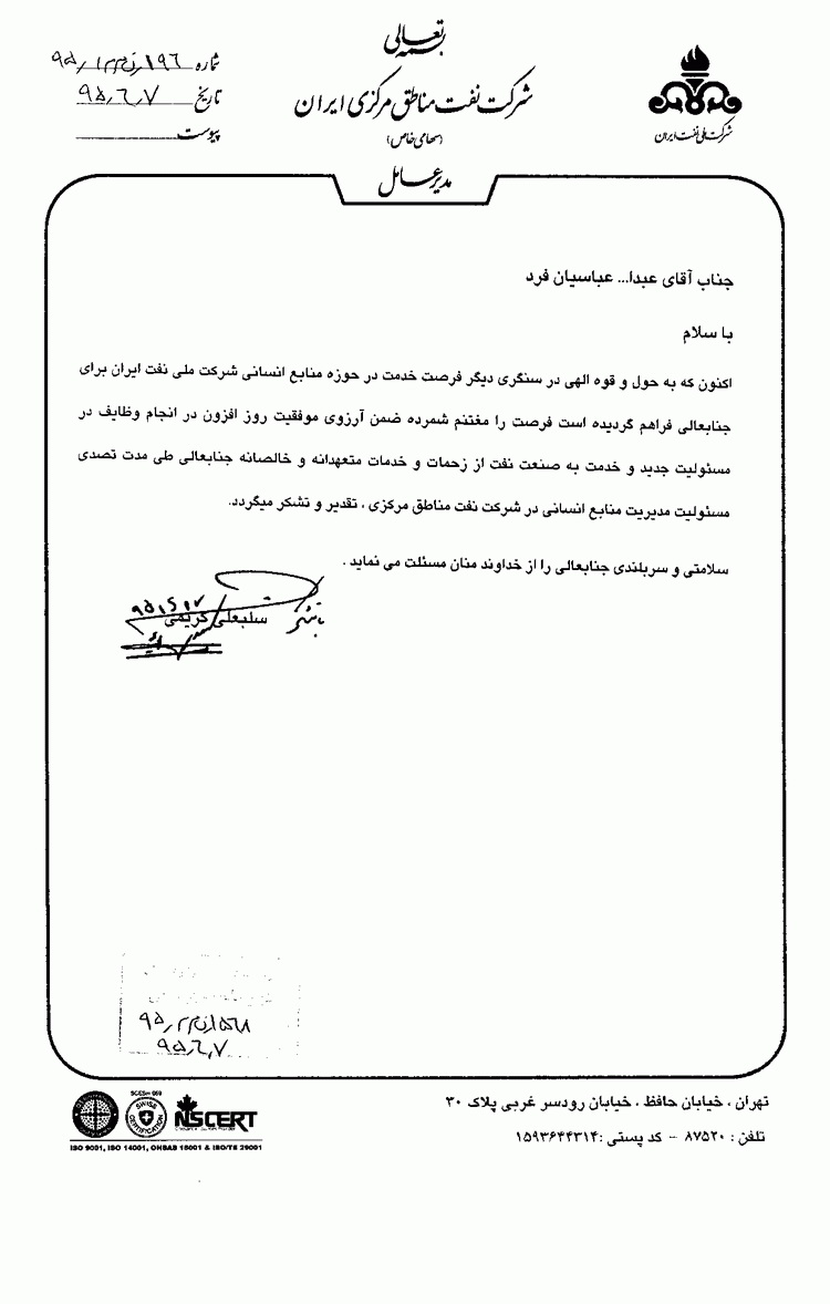 به گزارش روابط عمومی به موجب حکمی از طرف مهندس کریمی مدیرعامل شرکت نفت مناطق مرکزی ایران جناب آقای خلیل قاسم زاده بعنوان مدیر منابع انسانی نفت مناطق مرکزی منصوب و از خدمات جناب آقای عباسیان فرد مدیر سابق منابع انسانی شرکت در دوران تصدی این مسئولیت تشکر و قدردانی بعمل آمد.