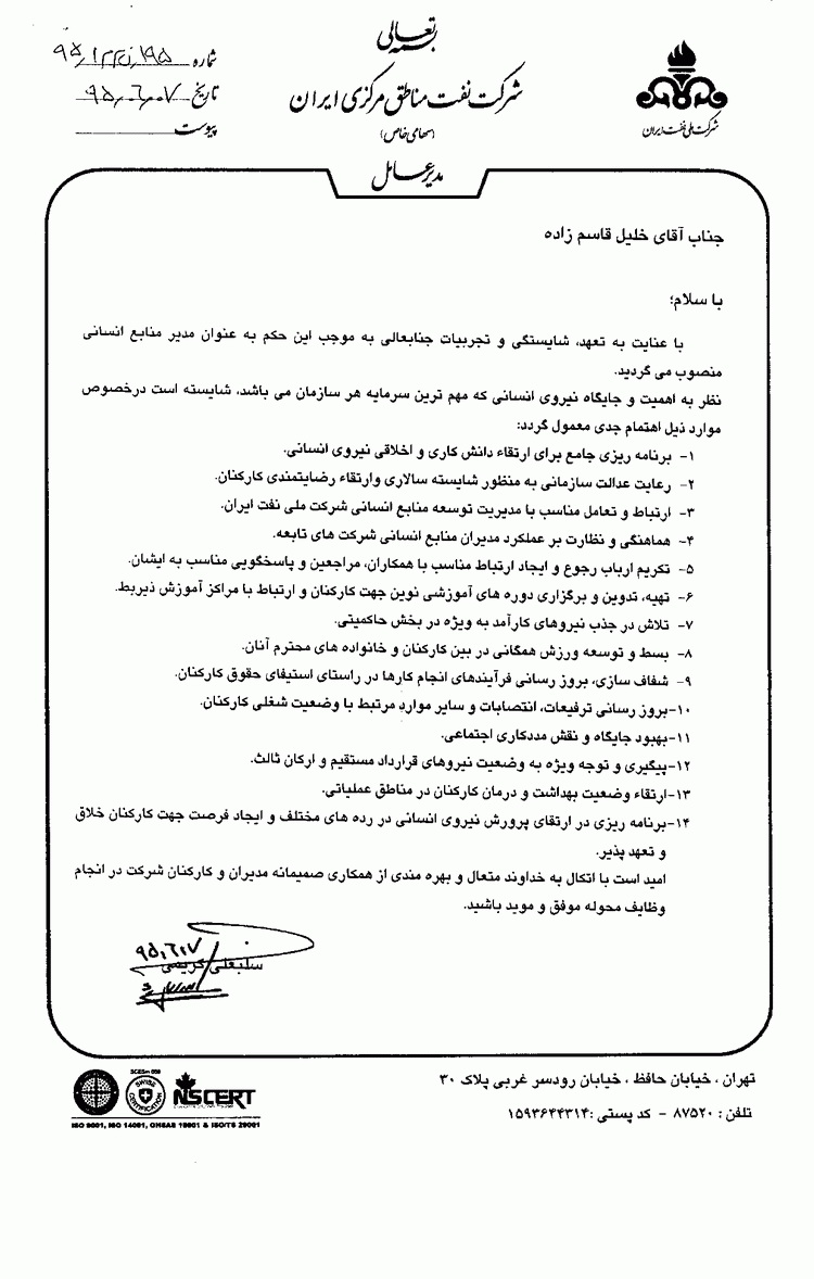به موجب حکمی از طرف مهندس کریمی مدیرعامل شرکت نفت مناطق مرکزی ایران جناب آقای خلیل قاسم زاده بعنوان مدیر منابع انسانی نفت مناطق مرکزی منصوب شد.