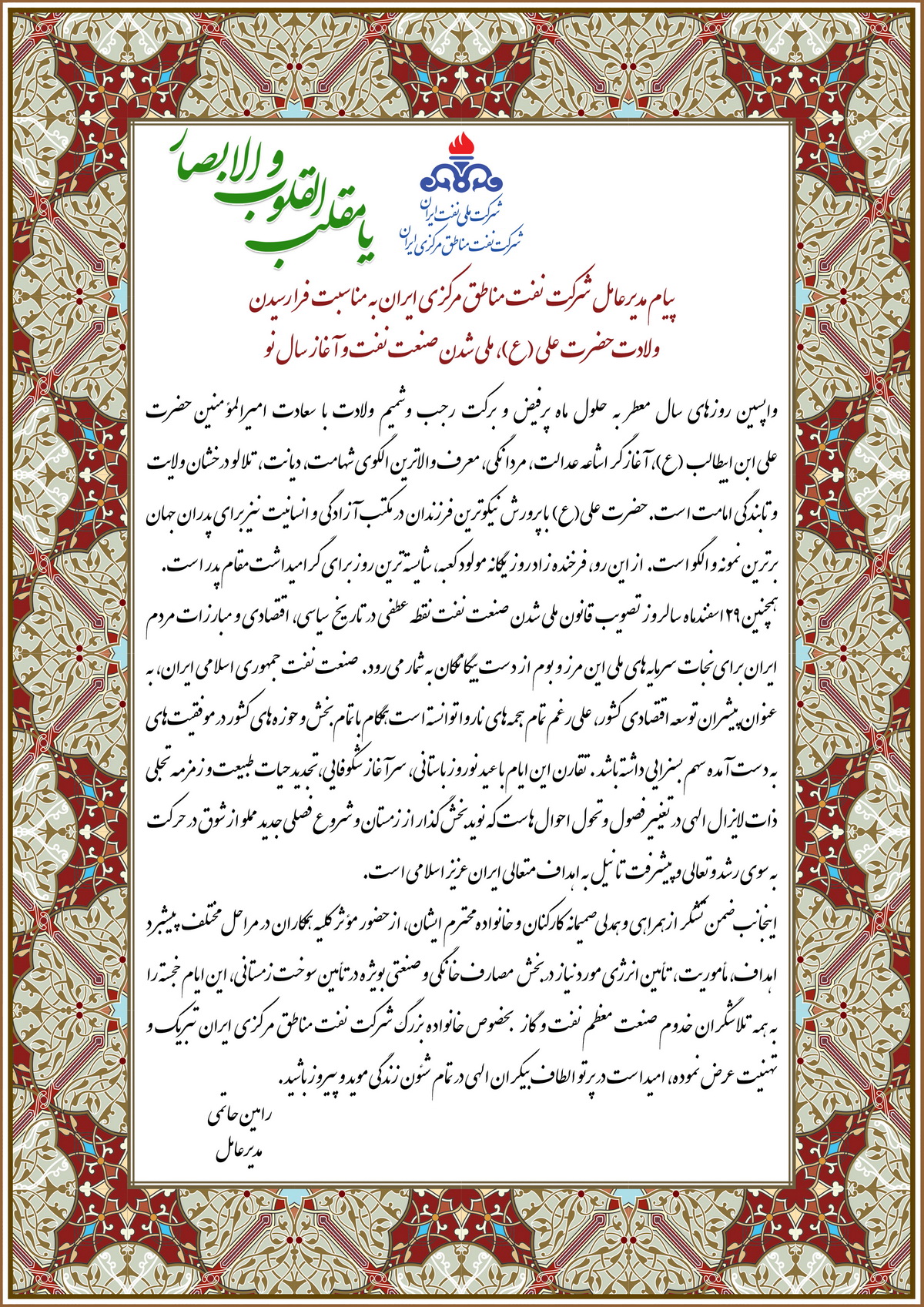 مهندس حاتمی مدیرعامل شرکت نفت مناطق مرکزی ایران بمناسبت ولادت حضرت علی (ع) و روز پدر, ملی شدن صنعت نفت و آغاز سال نو پیام تبریکی صادر کرد.