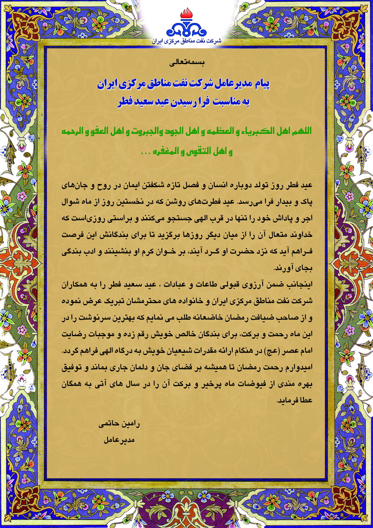 پیام تبریک مدیرعامل شرکت نفت مناطق مرکزی ایران بمناسبت حلول ماه شوال و عید سعید فطر