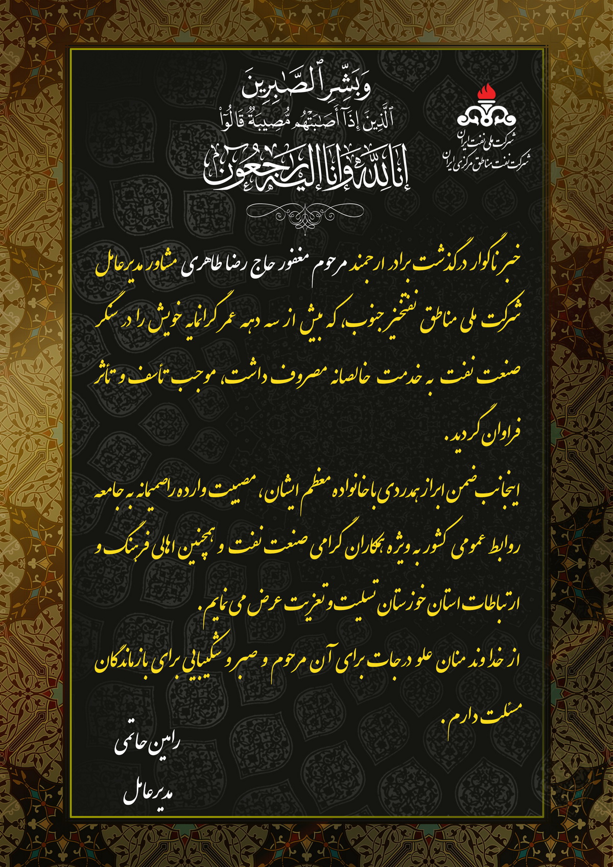 پیام تسلیت مدیرعامل شرکت نفت مناطق مرکزی ایران در پی درگذشت مرحوم رضا طاهری