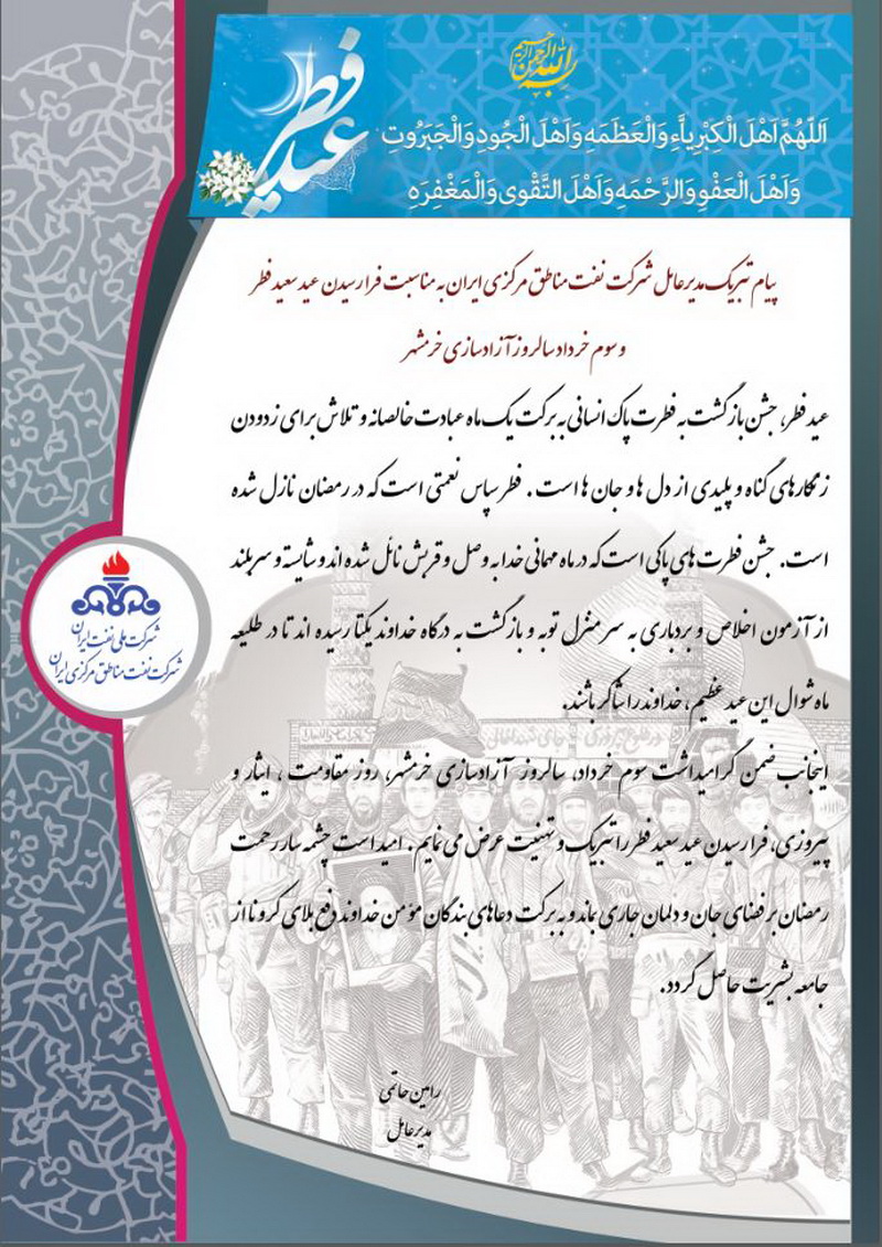 پیام مدیرعامل شرکت نفت مناطق مرکزی ایران به مناسبت عید سعید فطر و سوم خرداد سالروز آزاد سازی خرمشهر