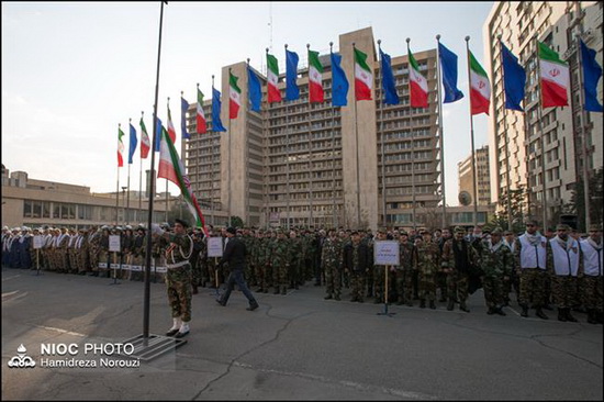 مراسم صبحگاه مشترک بسیجیان وزارت نفت، به مناسبت هفته بسیج با حضور بیژن زنگنه، وزیر نفت و معاونین وی در محوطه وزارت نفت برگزار شد.
