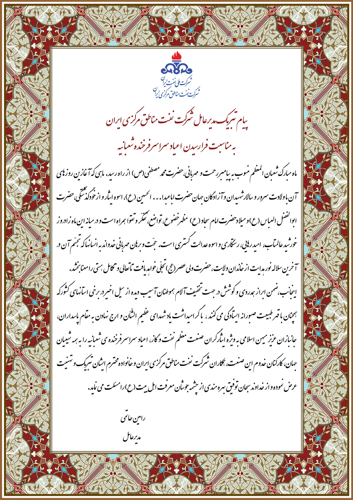 پيام تبريك مديرعامل شركت نفت مناطق مركزي ايران به مناسبت فرارسيدن اعياد شعبانيه