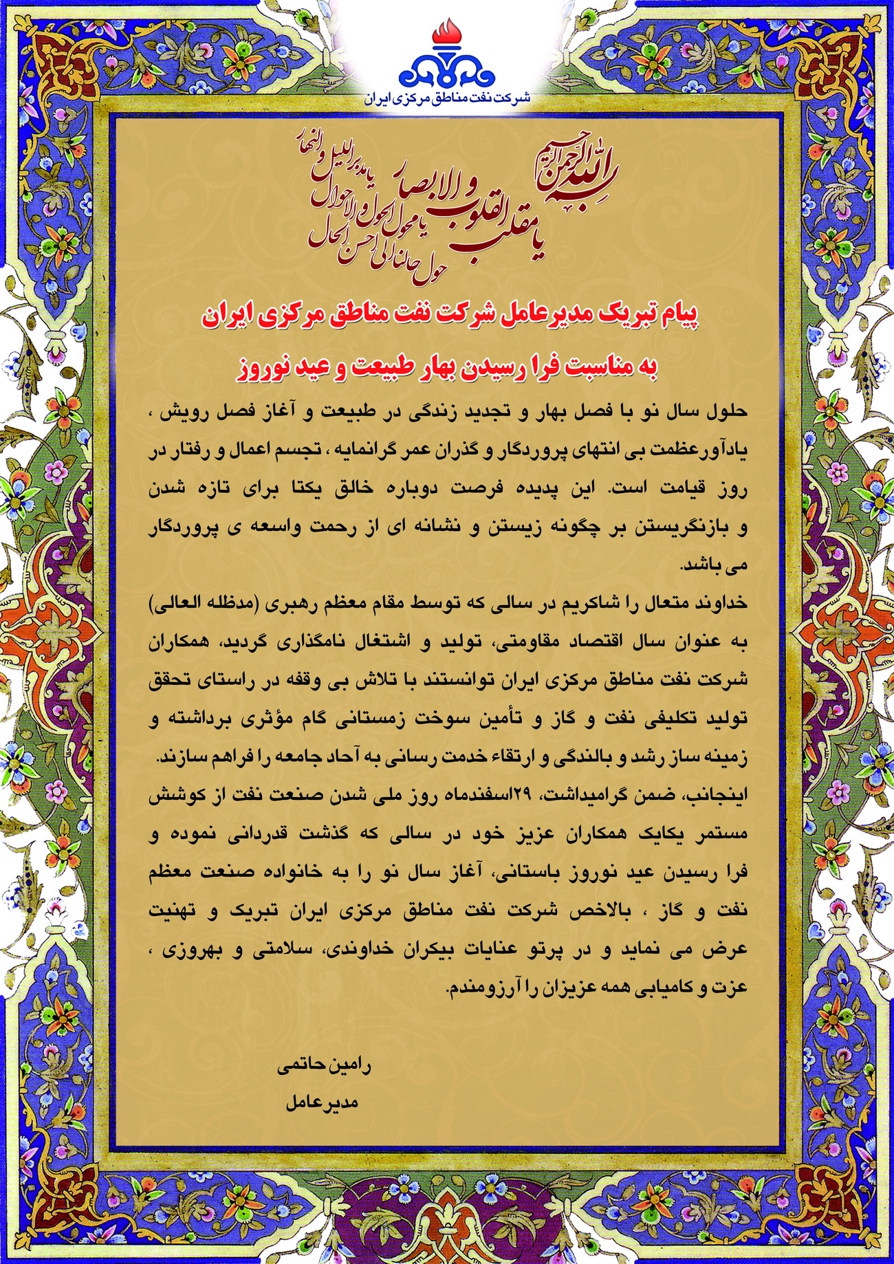 پیام تبریک مدیرعامل شرکت نفت مناطق مرکزی ایران بمناسبت فرا رسیدن عید نوروز