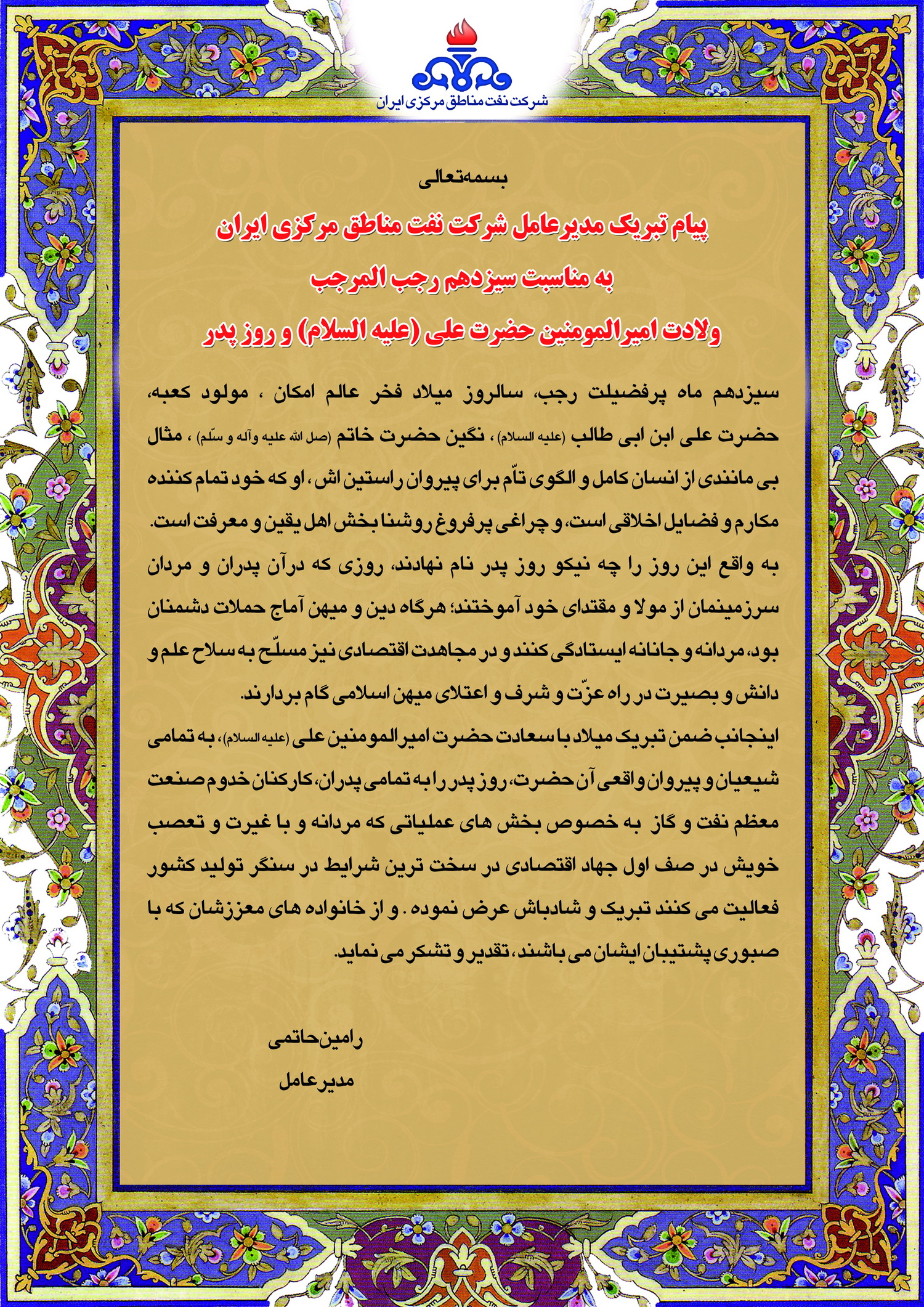 مهندس رامین حاتمی مدیرعامل شرکت نفت مناطق مرکزی ایران بمناسبت سیزدهم رجب سالروز میلاد با سعادت حضرت امیرالمومنین امام علی علیه السلام و روز پدر پیام تبریکی صادر کرد.