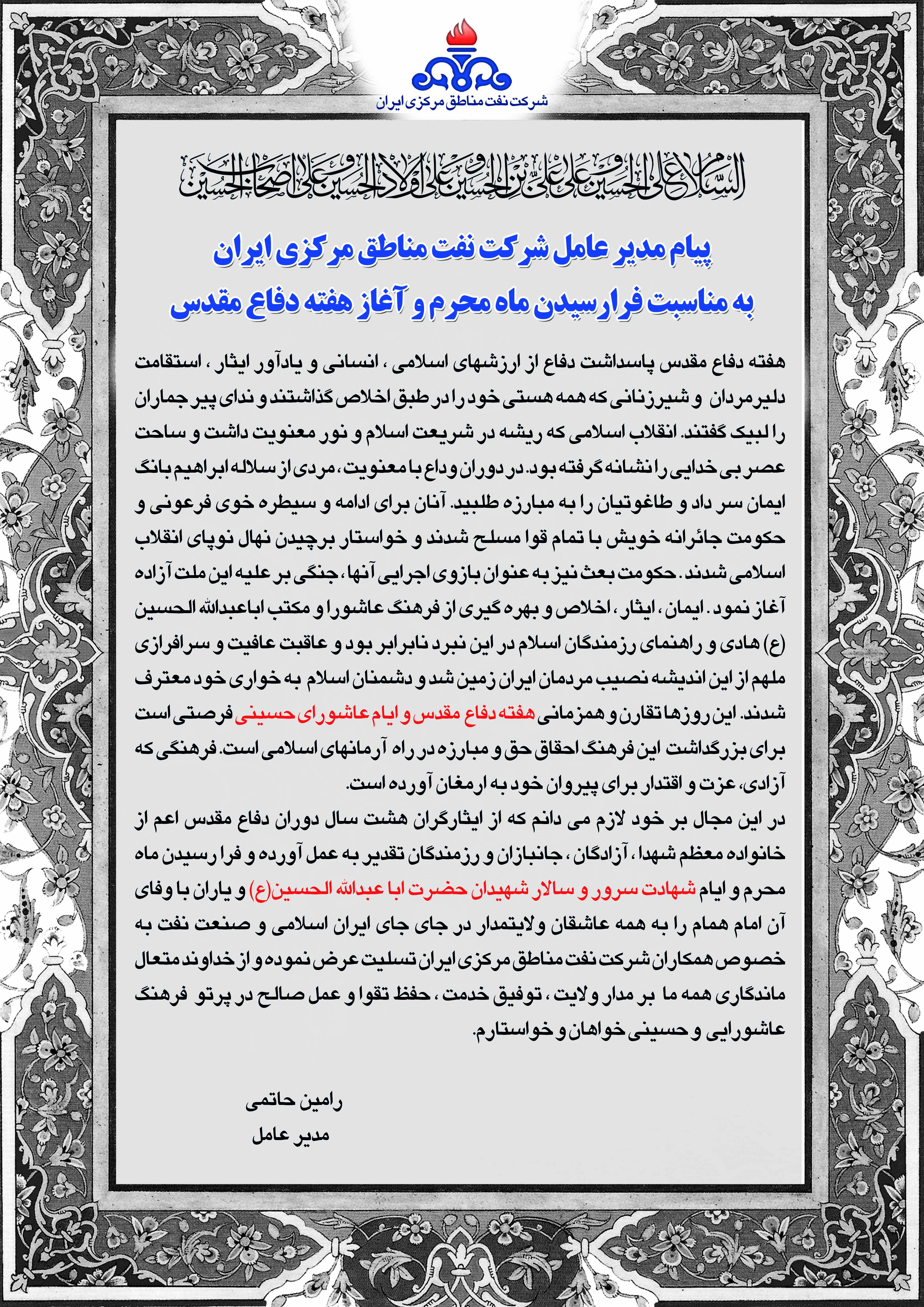 پیام مدیرعامل شرکت نفت مناطق مرکزی ایران بمناسبت فرا رسیدن ماه محرم و هفته دفاع مقدس