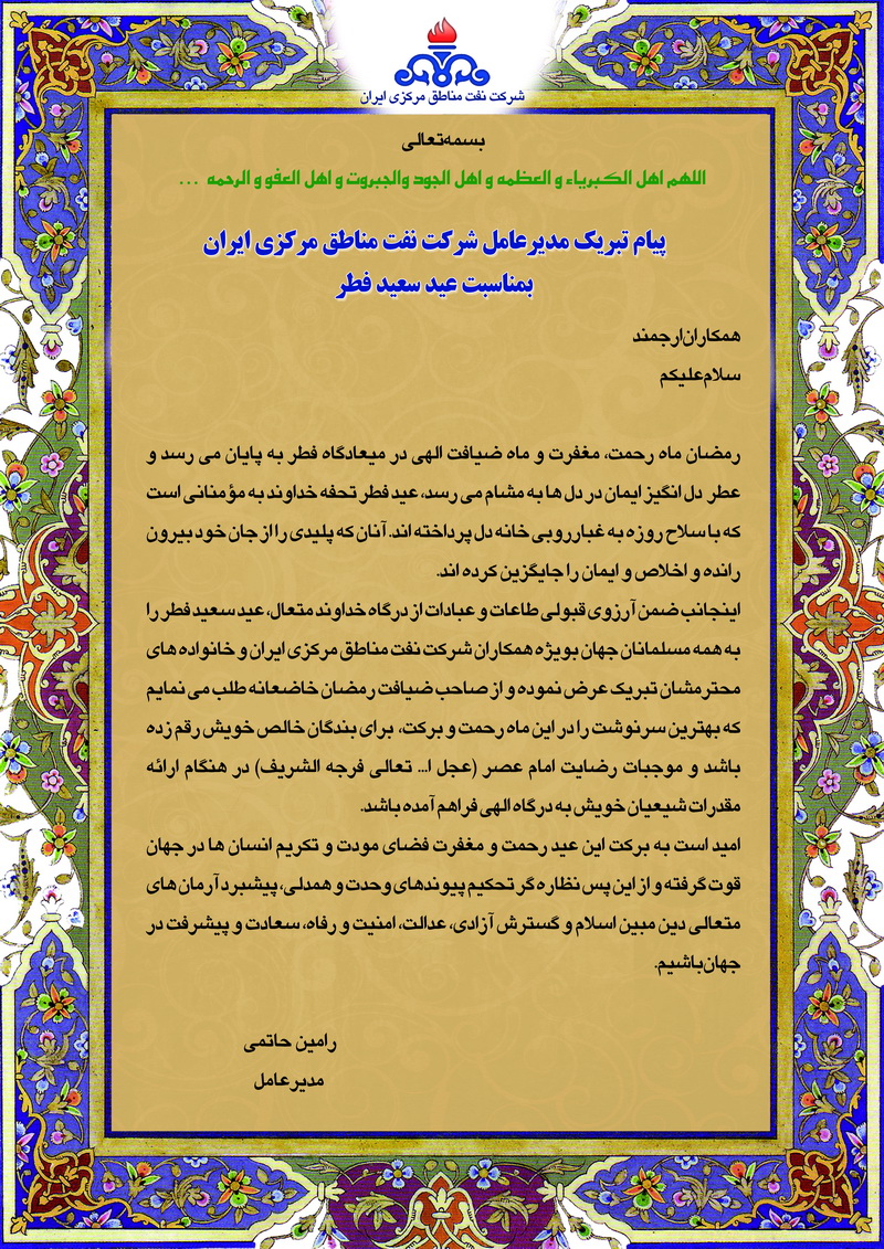 پیام تبریک مدیرعامل شرکت نفت مناطق مرکزی ایران بمناسبت عید سعید فطر