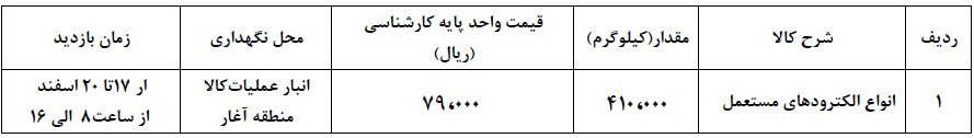 مزایده شماره ف‌ن‌م 903-99 ت 1 مربوط به فروش انواع الكترود از رده خارج و غير قابل استفاده واقع در انبار عمليات كالا منطقه آغار شرکت نفت مناطق مرکزی ایران شماره مرجع ستاد 1099093221000005
